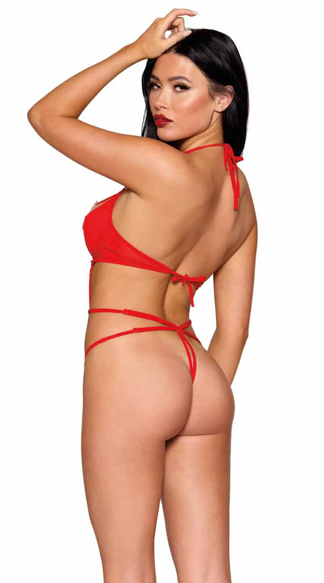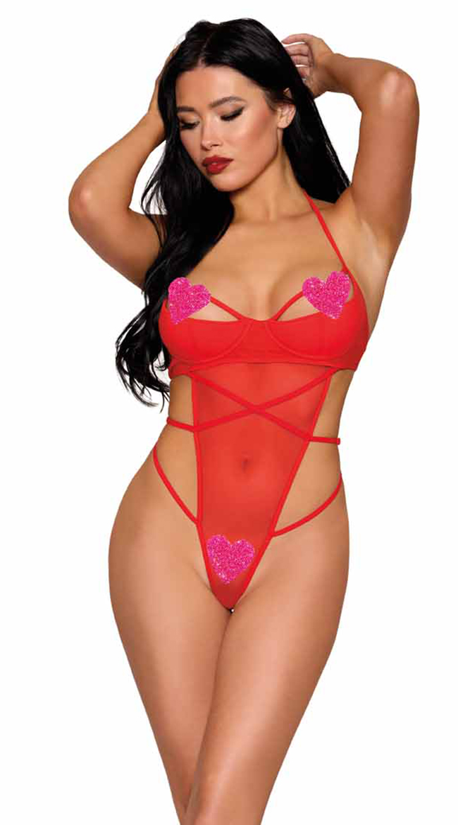 • Open-crotch teddy with rhinestone heart appliqués, back ties,