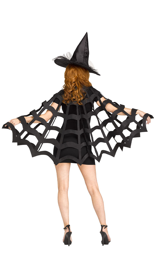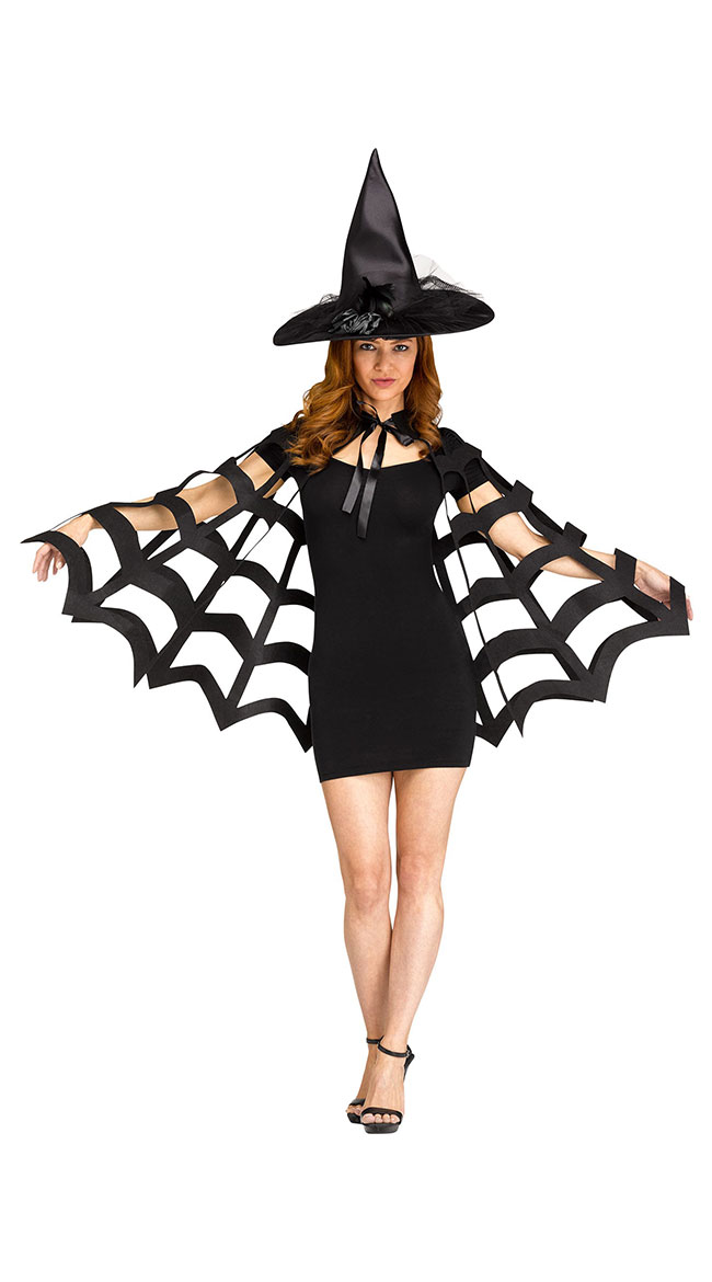 Cast wicked spells with one swish of your cape! This beautiful die-cut web capelet accessory features a midi length, lightweight fabric, and a satin tie closure. (Dress, witch's hat, and heels not included.)