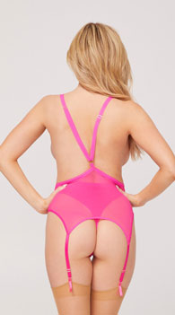 Light up your bedroom in this sexy bustier set featuring a loose, sheer lace bust with a plunging V-neckline, adjustable spaghetti straps, a sheer mesh bodice, a low open back, adjustable garter straps, a matching high waisted panty with a cheeky cut back, and nude thigh high stockings with an opaque top. (Thigh high stockings not included.)