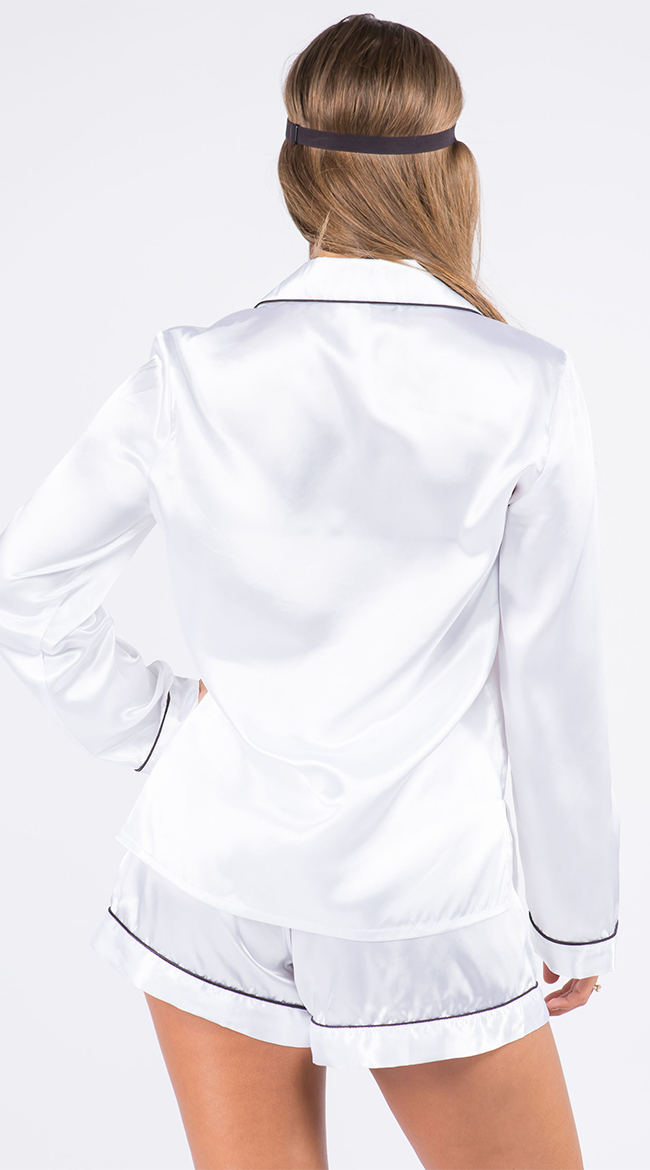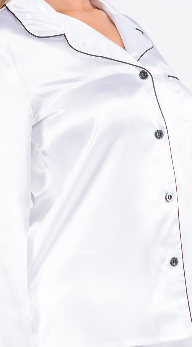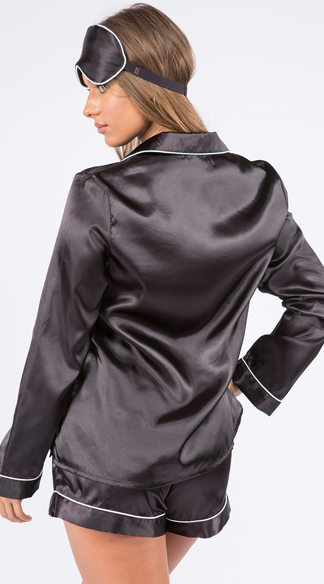 Sleep in luxury in this plus size satin pajama set featuring a top with long sleeves, a front pocket, front button closures, matching high waisted shorts, and a matching eye mask.