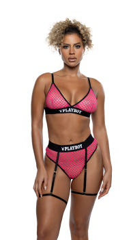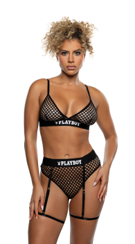 Barely-there texture. Bold Playboy edge. The Playboy Fishnet Plunge Bra and Garter Thong Set delivers a sleek, body-framing fit with classic fishnet and a deep plunge neckline that puts confidence front and center. Logo-print elastic adds iconic contrast, while the attached garter straps bring a flirty, after-dark finish. Finished with a thong back, this set is fearless, flattering, and made to be seen.