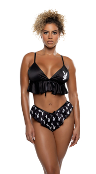 Soft shine. Icon energy. The Playboy Bunny Satin Peplum Bralette and Short Set blends playful branding with an easy, feel-good fit. The stretch satin bralette features a flirty peplum hem and signature Bunny logo, while the matching shorts show off an allover Bunny print with flutter leg openings for a relaxed, flattering finish. Cute enough to lounge. Hot enough to be seen.