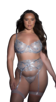 Step into your star power with this shimmering silver lace lingerie set — a three-piece fantasy made to turn every moment into a main-event. The sheer underwire bra gives sculpted lift, the matching thong brings that barely-there tease, and the high-rise garter belt? She’s the show-stealer, cinching the waist and serving pure goddess energy. With metallic floral lace and satin straps that catch the light, this set is your ultimate “I know I look incredible” moment.
