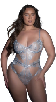 Meet the lingerie that looks like it was crafted by moonlight. This shimmering silver lace cut-out teddy brings flirty structure with underwire cups, a sheer sculpting panel, and waist-baring cutouts that know exactly how to hype your curves. Satin bow details keep the vibe sweet, while the high-leg silhouette brings the heat. It’s sexy, ethereal, and absolutely here to cause problems (the fun kind).