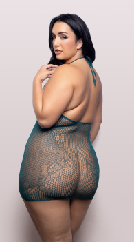 Designed with a high neck silhouette and a curve-contouring fishnet lace knit, this mini dress gives you that sculpted, second-skin feel with just the right amount of reveal. The intricate lace detailing adds a soft, romantic edge while the allover sheer finish keeps things bold.