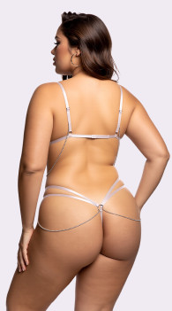 Part jewelry, part fantasy. This crotchless teddy features open cups and draped rhinestone chains that sparkle with every move.