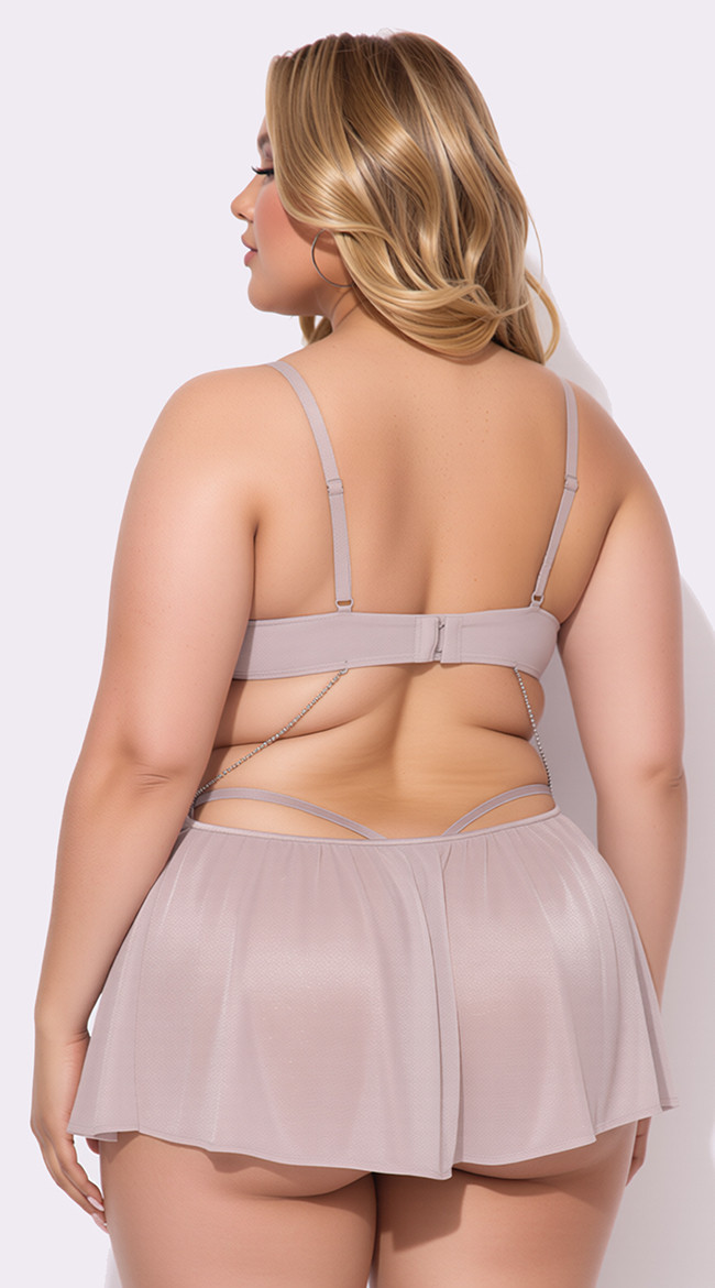 Sweet yet scandalous, this shimmer mesh babydoll teases with side cutouts and chain accents, paired with a cheeky G-string.