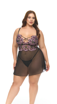Romantic from every angle, the Curvy Adela Floral Sheer Babydoll is designed to enchant. Featuring a boned bodice with sheer floral embroidery, this babydoll offers soft structure with an effortlessly feminine touch. The adjustable shoulder straps frame the neckline, while the flowing mesh skirt and matching G-string complete the look. Dreamy and delicately detailed, it’s a sheer lingerie favorite for moments that call for something unforgettable.