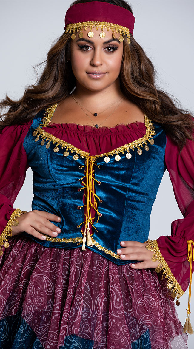 Everything that you see in the picture comes with the costume including the head band, except for the jewelry that's on the model. Its true to size I ordered a 3x and it fits perfectly and feels good! the color of the costume is exactly the same as the picture. Shipping was so fast it arrived earlier than the estimated arrival time. if you are thinking of getting it I highly recommended, because its well made and its beautiful on.