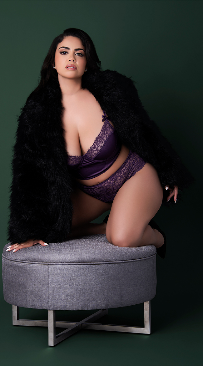 • Wet look balconette bustier with scalloped edge lace at the top of the cup, plum bows