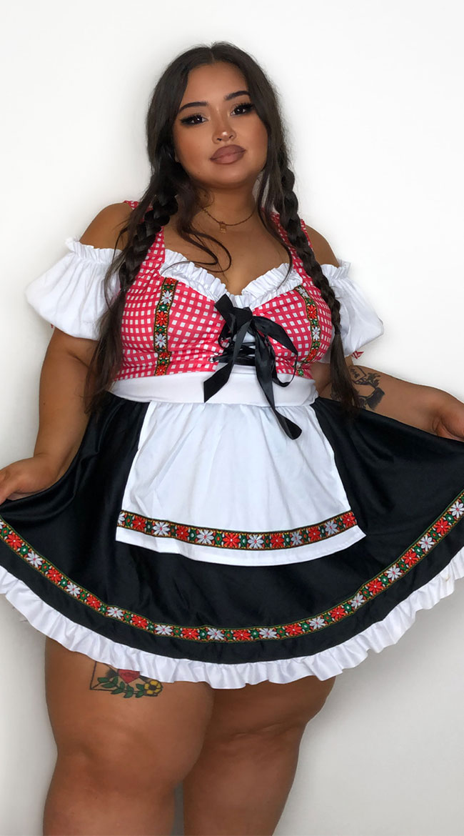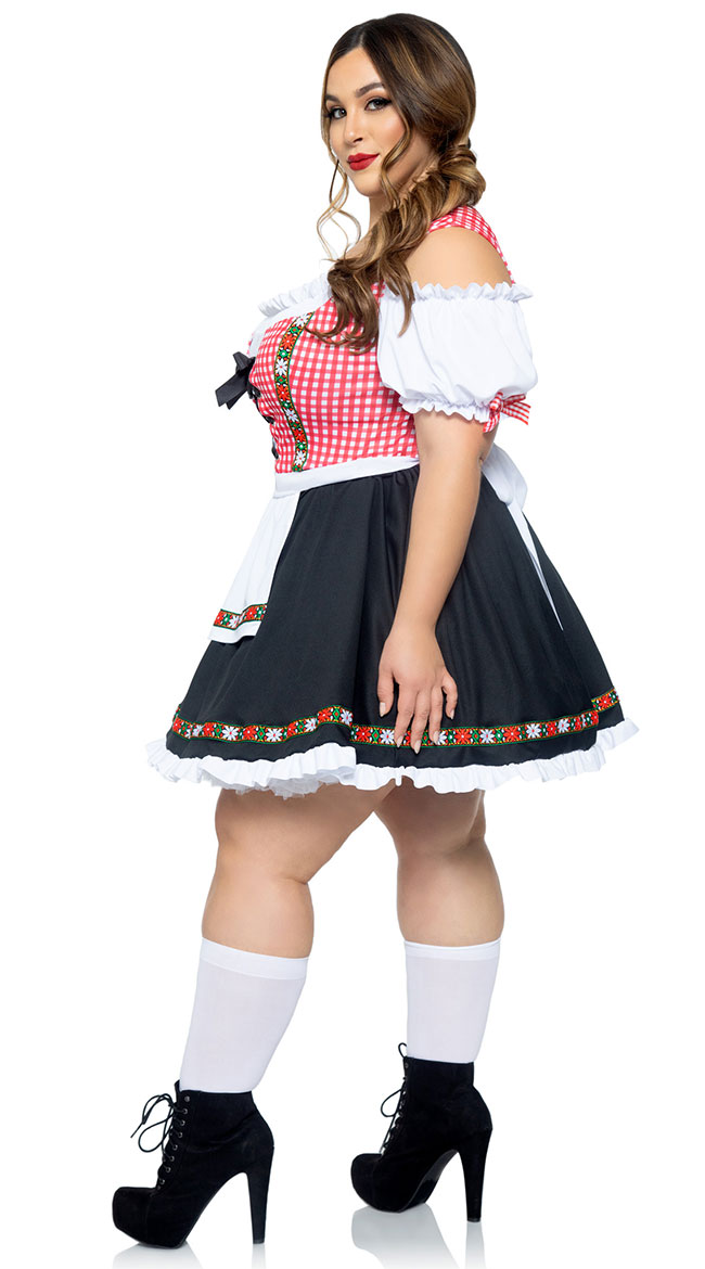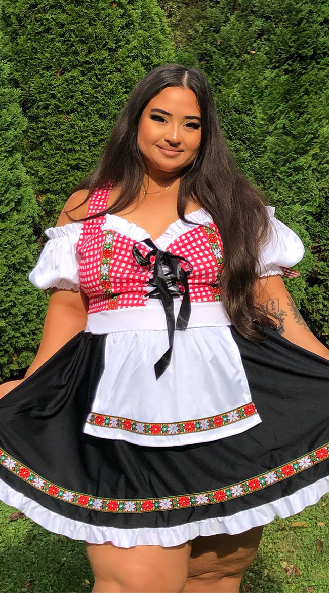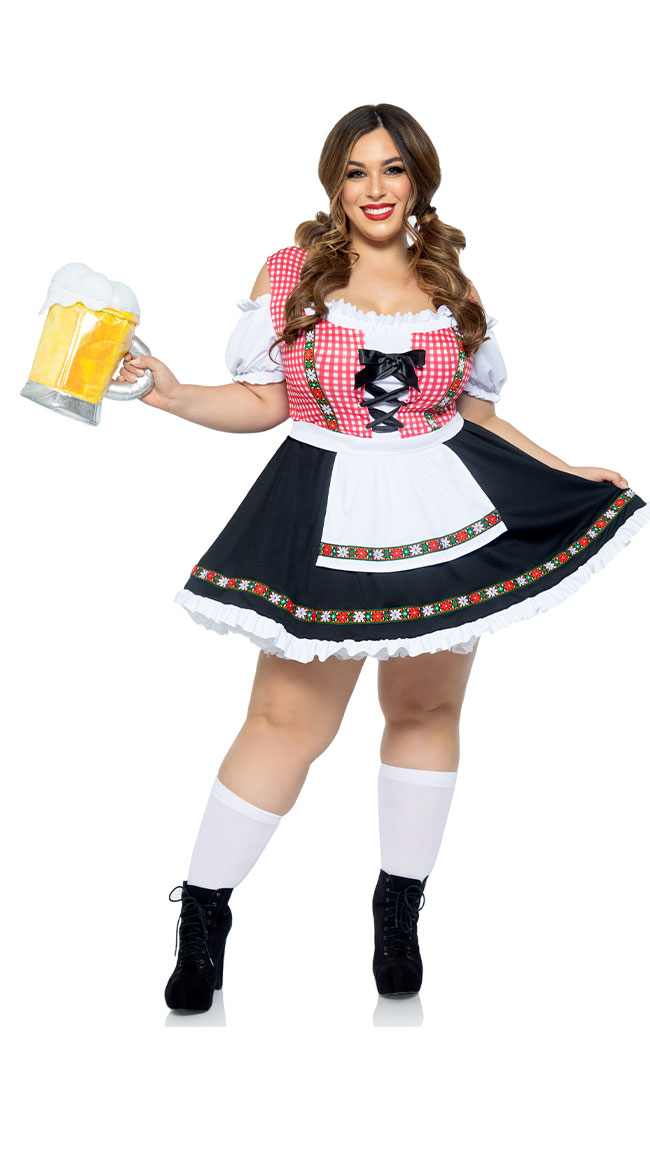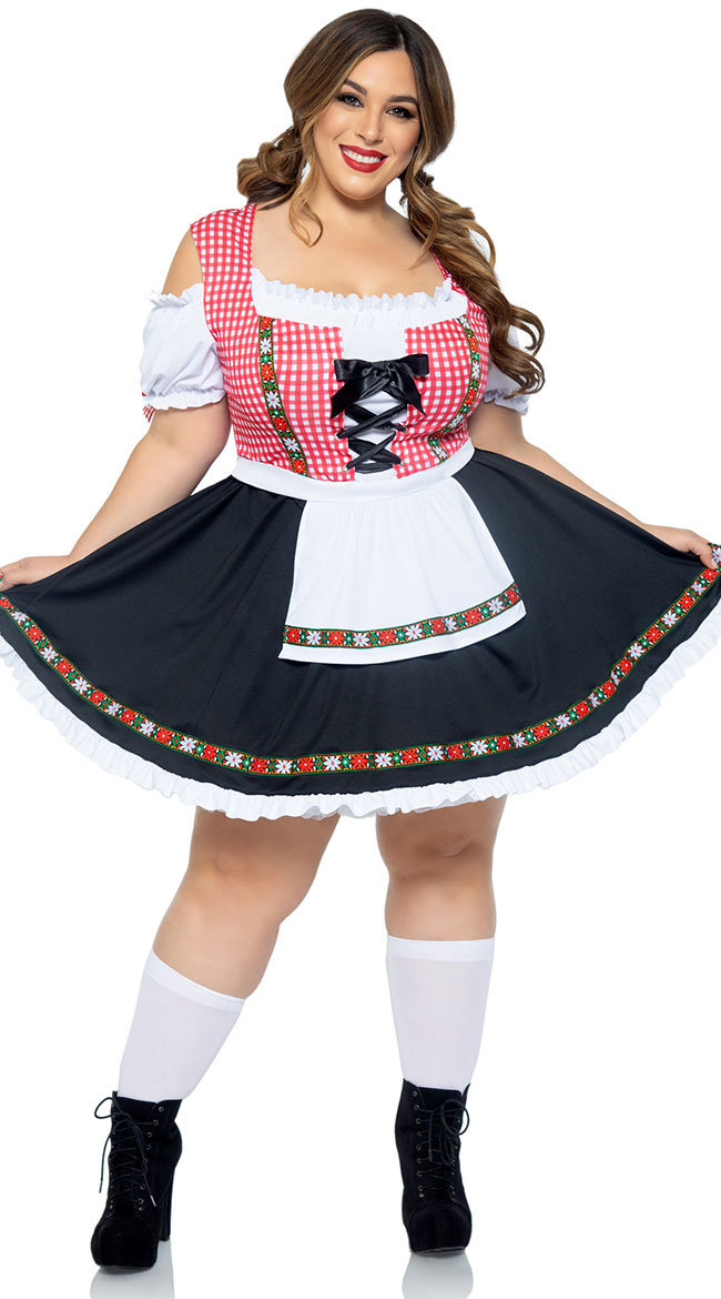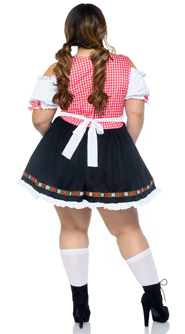 Cheers! You'll have everyone ordering another round in this plus size Beer Garden Babe costume featuring a cold shoulder gingham peasant dress, a lace-up front detail, an attached apron, and floral ribbon trim. (Petticoat, socks, and boots not included.)