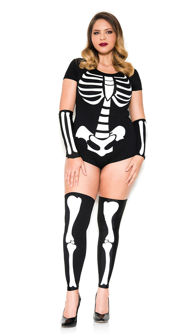 You're looking quite bad to the bone! Let your skeletons out of the closet in this plus size Bone Babe costume featuring a short sleeve bodysuit with a skeleton print front, a back zipper closure, and a cheeky cut back, and matching bone print arm warmers. (Thigh high stockings not included.)