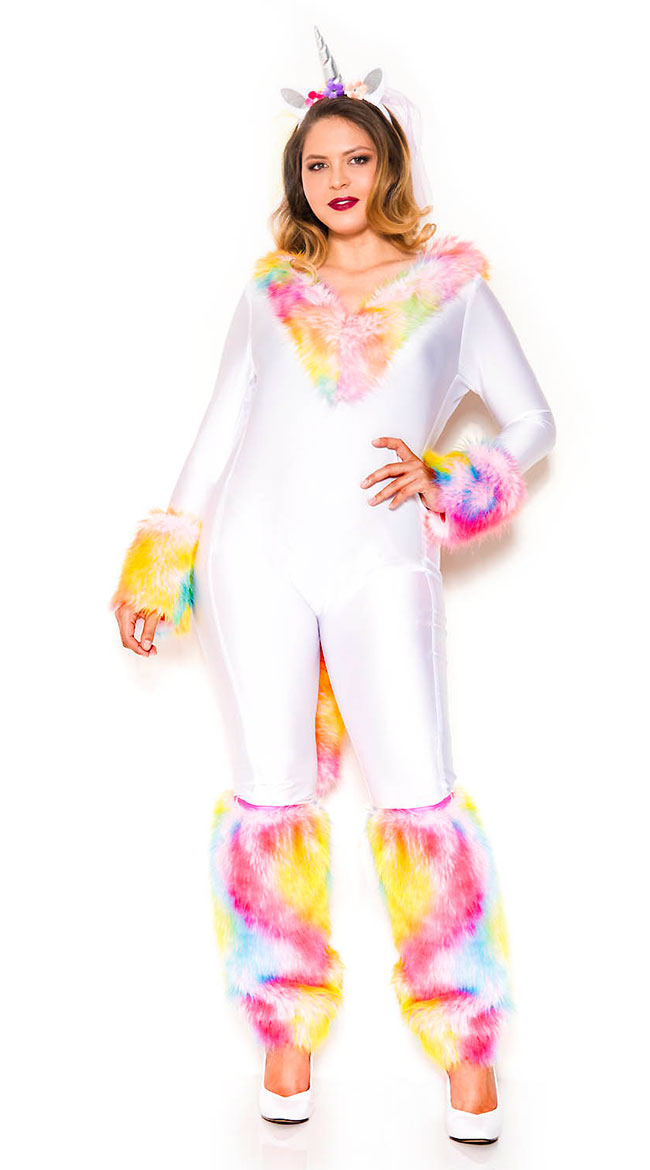 Frolic through a forest filled with mythical and fantastic creatures! Delight and awe in this plus size Breathtaking Unicorn costume featuring a white jumpsuit with a rainbow trim V-neckline, faux fur trim wrist cuffs, an attached faux fur rainbow tail, rainbow leg warmers, and a silver unicorn horn headband with rainbow accents.