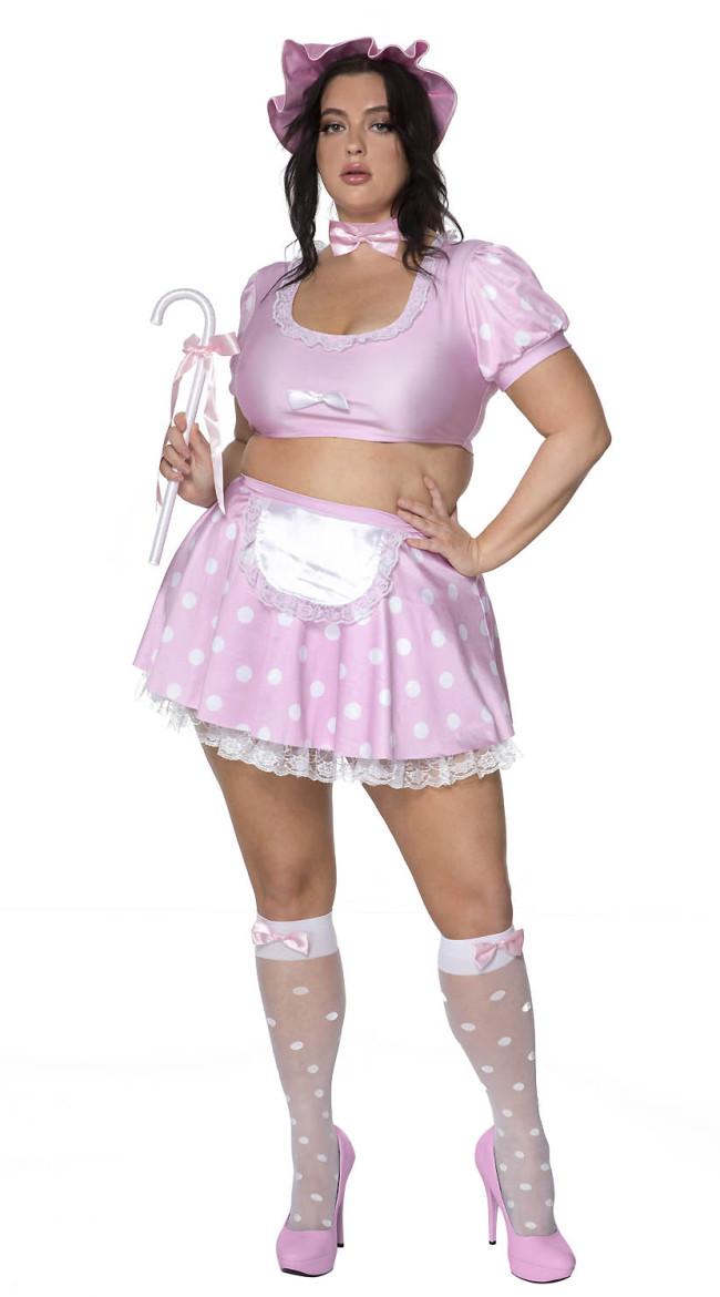 Step into sweet and sassy fantasy with this plus size storybook cutie costume. Featuring a pink polka dot crop top with puff sleeves, a matching flirty skirt with lace trim, an apron detail, bow choker, and coordinating headpiece, this set is pure bedtime fairytale fun. Add the included sheer dot stockings and toy staff for a look that’s equal parts innocent and oh-so-naughty.