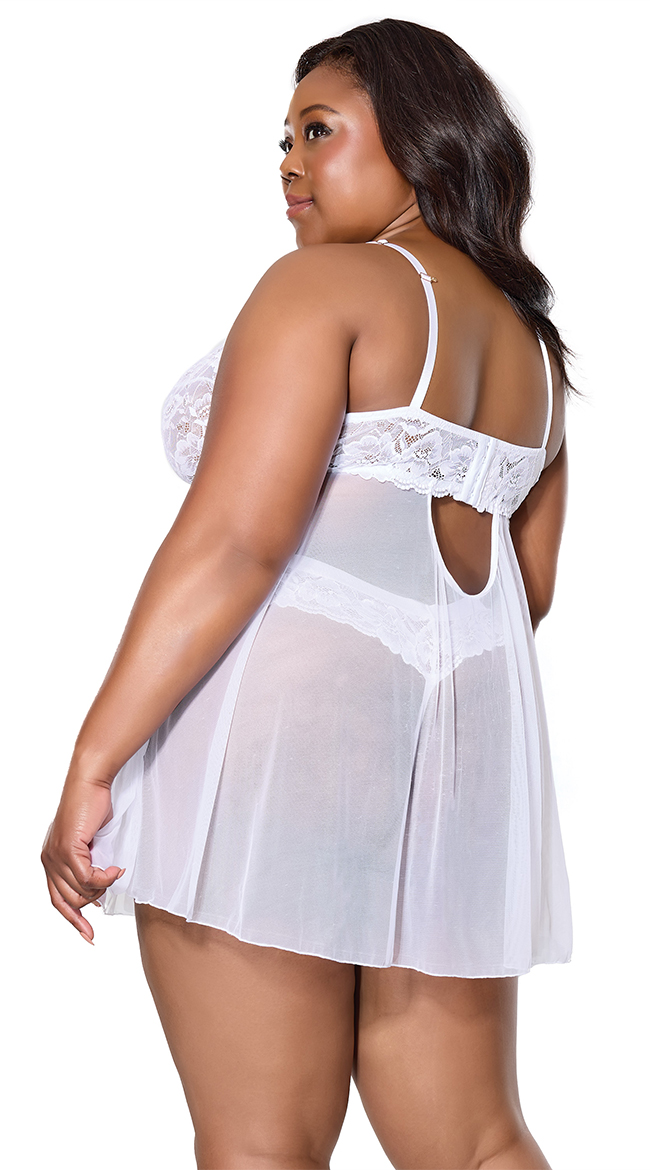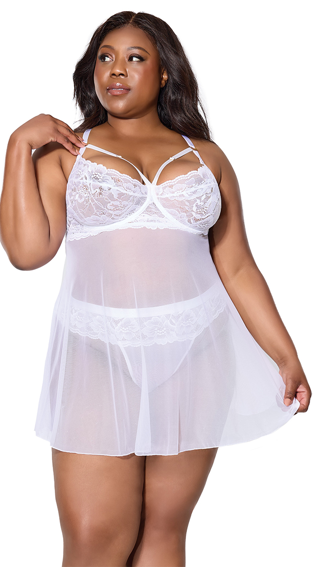 This enchanting babydoll and thong set combines delicate charm with modern allure. The babydoll features soft cups with underwire for gentle support and shaping, while adjustable straps with ring accents and hookable sliders ensure a customized fit. An elasticized underbust enhances comfort and defines your silhouette, complemented by a seductive back keyhole with a hook-and-eye closure. The high-waist thong, designed with an elasticized waistband, adds a flattering and comfortable touch. Accented with gold-tone hardware, this set offers a perfect balance of elegance and sensuality.