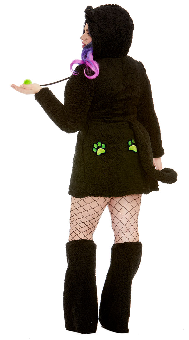 It's not easy being purrfect! They won't be able to keep their paws off of you in this plus size Cross My Path Cat costume featuring a black hooded sherpa dress with pom-poms, a zip-up front, neon paw prints on the back, a removable tail, matching boot covers, and a satin bell choker. (Wig and stockings not included.)