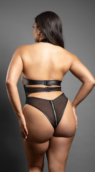 • High-shine leatherette and sheer mesh for dramatic, body-sculpting contrast