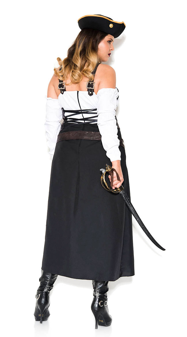 Make them walk the plank if they won't follow your rules! Manage your unruly crew in this plus size Cutlass Captain costume featuring a high slit dress with a ruffled sweetheart neckline, ruched cups, adjustable criss-cross straps, and a back zip closure, a lace-up waist cincher, an adjustable belt, puffed long sleeves with ruffle details, and a captain's hat with gold trim. (Leggings and pirate sword not included.)