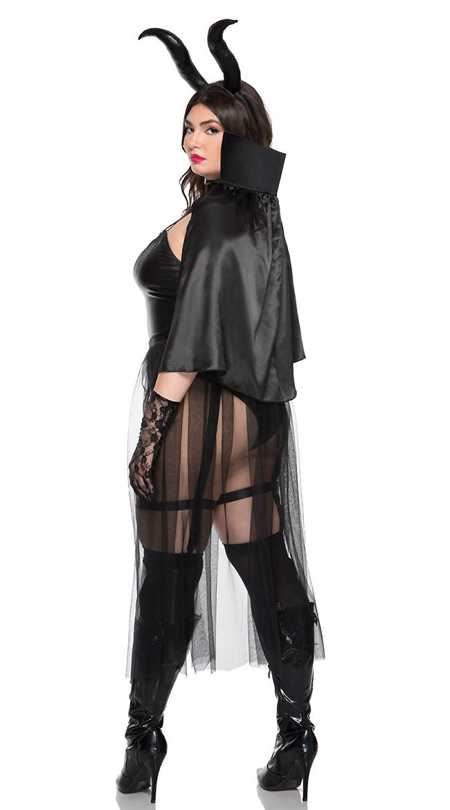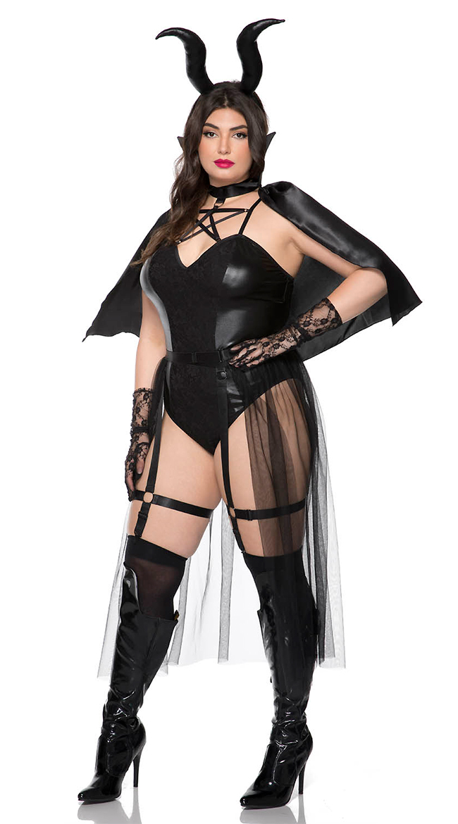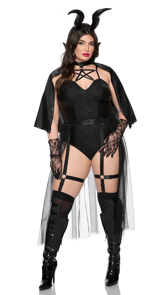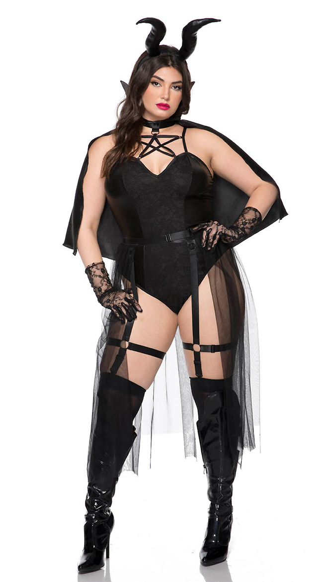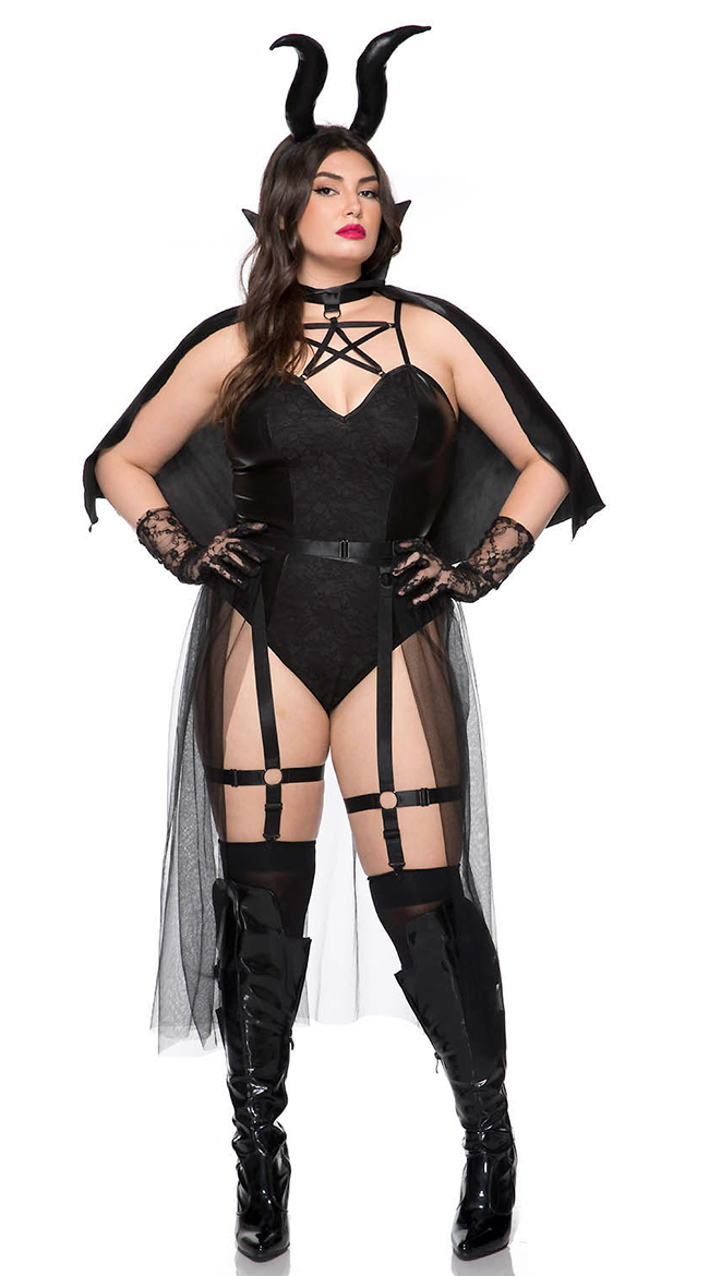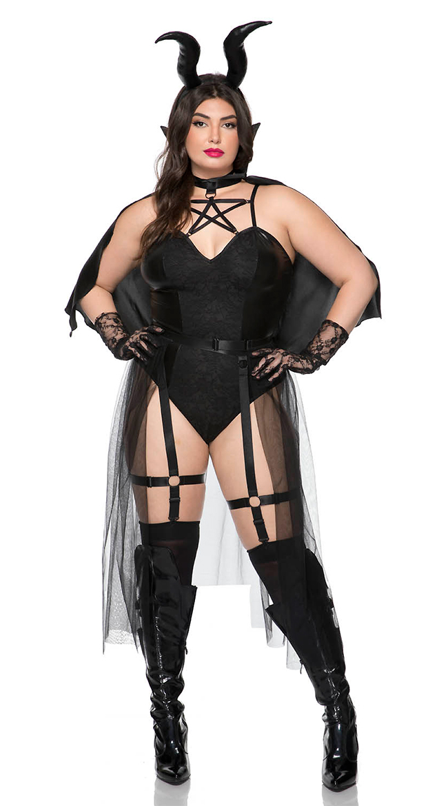 • Plus size black teddy bodysuit with pentagram and contrast lace detail