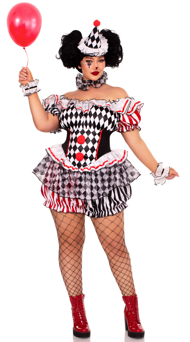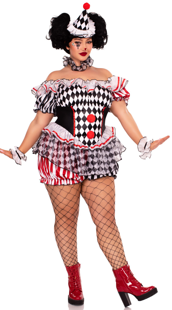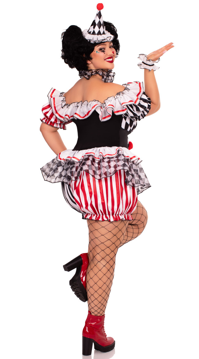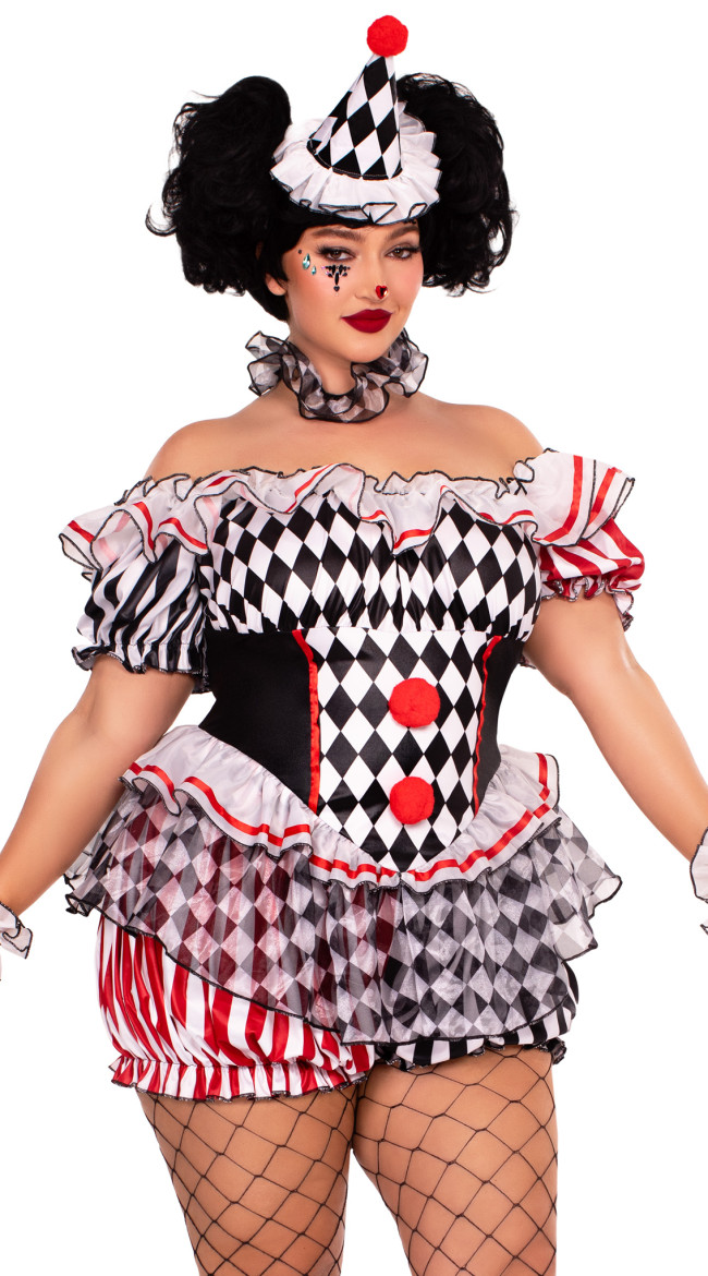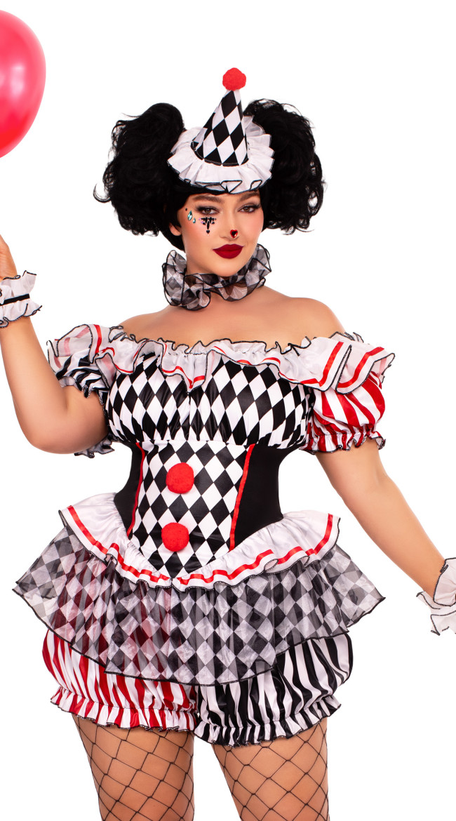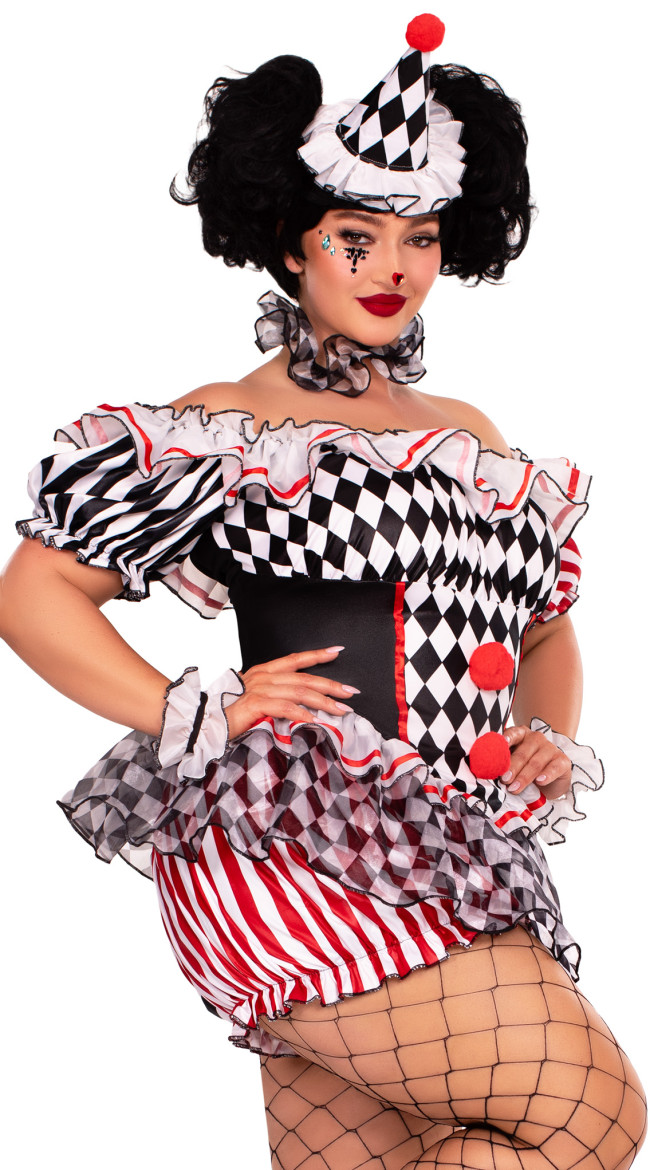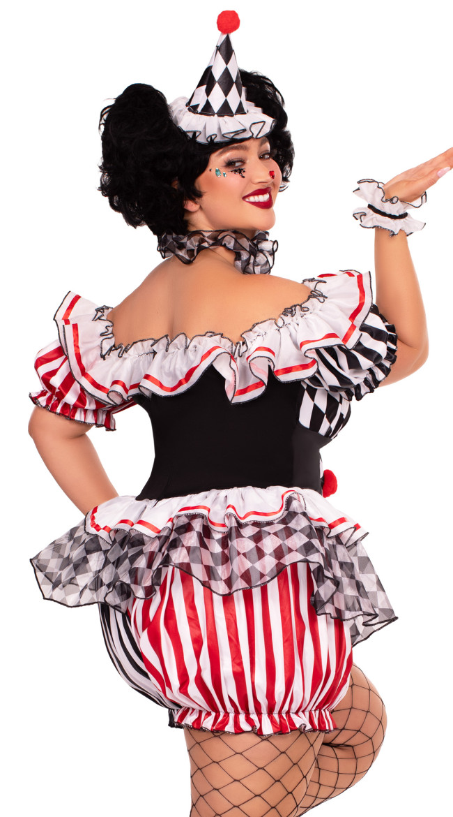 Step into the spotlight in this Sexy Harlequin Clown Romper! The bold checkered print and ruffled details give this playful look a flirty twist, while the off-the-shoulder neckline and puff sleeves add a touch of fun. Complete with a quirky matching hat and button accents, this romper is perfect for showing off your bold, playful side.