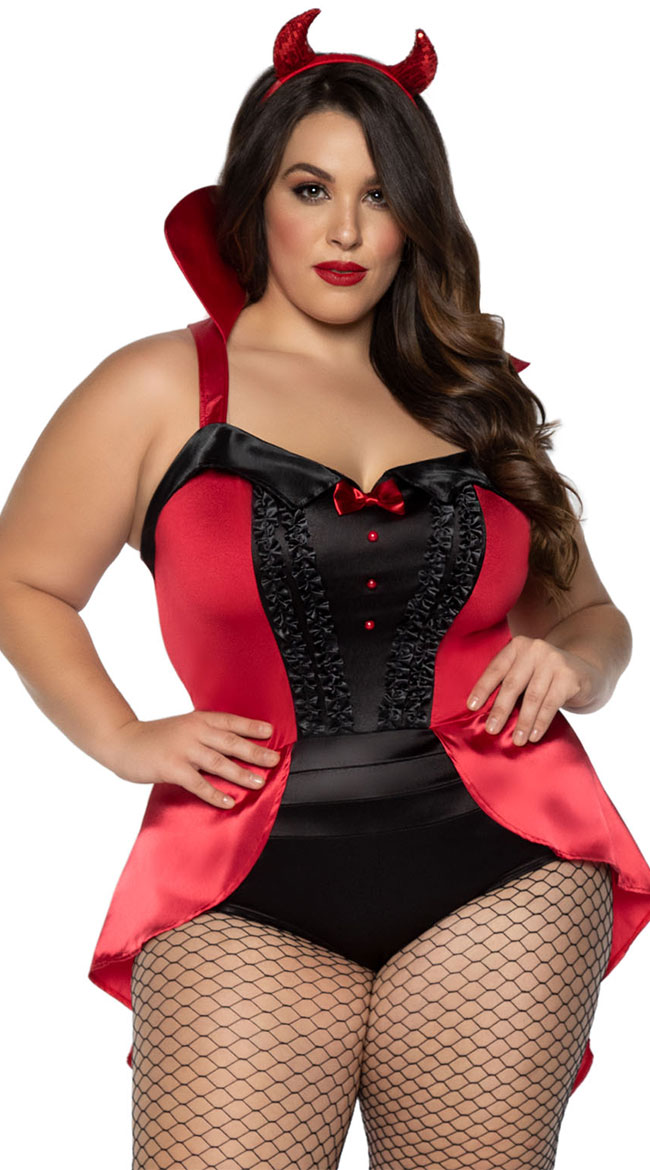 Are you burning with desire? Raise hell in this plus size Devilish Darling costume featuring a red and black satin bodysuit with a ruffled bodice and covered buttons, a satin bow accent, an attached stand up collar, a cascading skirt with a pin-on devil tail, and a sequin devil horns headband. (Stockings not included.)