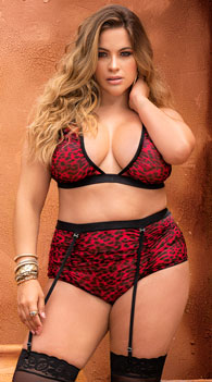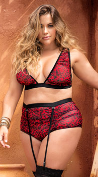 Show off your fierce side in this hot plus size bra set featuring sheer mesh cups with an animal print, double adjustable spaghetti straps, a back hook closure, and a matching, high waisted panty with adjustable garter straps and a cheeky cut back. (Stockings not included.)