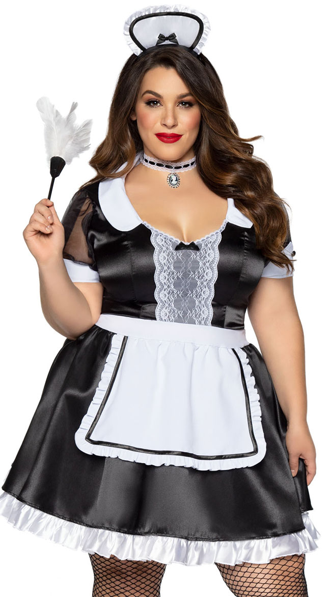 Clean up your act, honey! You'll be whispering Dirty no more in this plus size Filthy & Flirty costume featuring a black and white lace trimmed dress with a collar and attached apron, a lace cameo choker, and a matching headpiece. (tickler, petticoat, and stockings not included.)