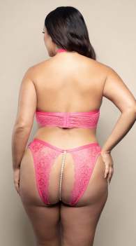 Flirty meets fearless. The Plus Size Halter Bra Set with Pearl Details is all about soft shimmer and bold confidence, featuring lace that hugs your curves and luxe pearl accents that catch every glance. The halter bra lifts and shapes with underwire support, while the center pearl string detail adds that extra touch of shine. Paired with an adjustable crotchless pearl panty, this set brings just the right mix of sweet, sultry, and unapologetically confident energy.