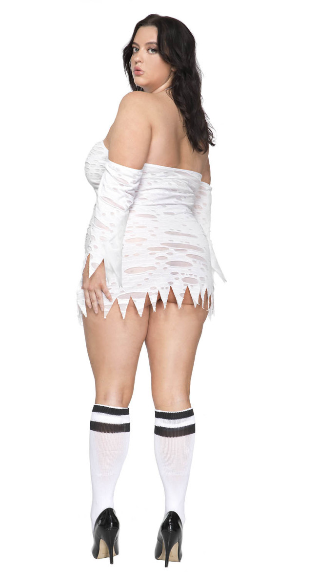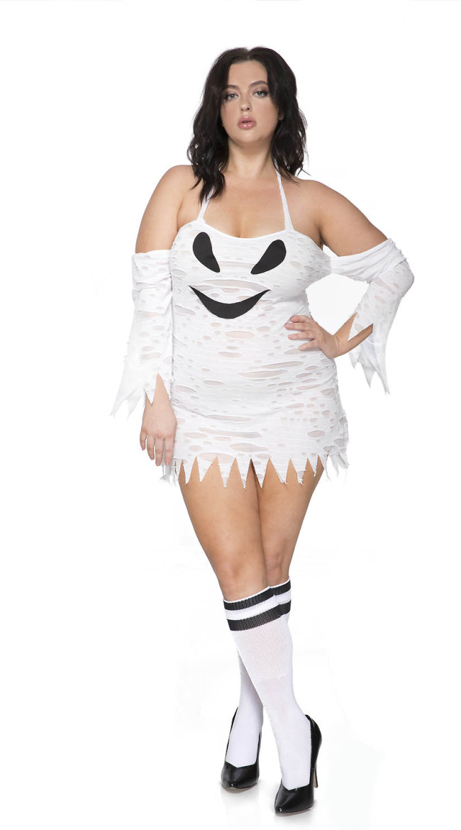 Steal the spotlight in this plus size Haunting Ghost costume! Featuring a shredded white mini dress with jagged trim, a cheeky ghost face front, and matching detached sleeves, this look is spooky, sexy, and totally unforgettable. Perfect for floating through any Halloween party with flirty, ghostly charm.