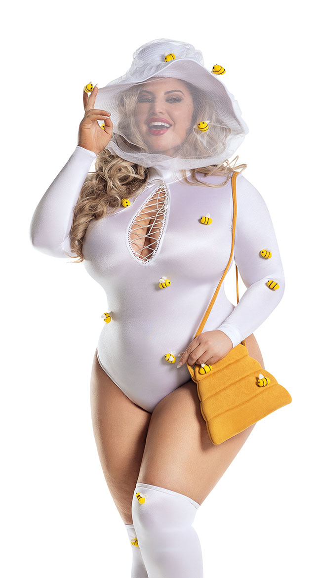 Be the buzz of your Halloween party with this plus size Honey Beekeeper costume featuring a white romper with a lace-up bust panel, long sleeves, a back zipper closure, allover bee appliques, a cheeky cut back, matching legwarmers, a matching hat with a mesh veil, and a yellow beehive purse.