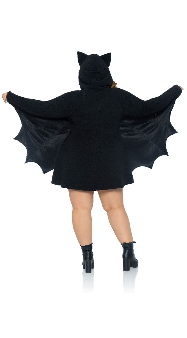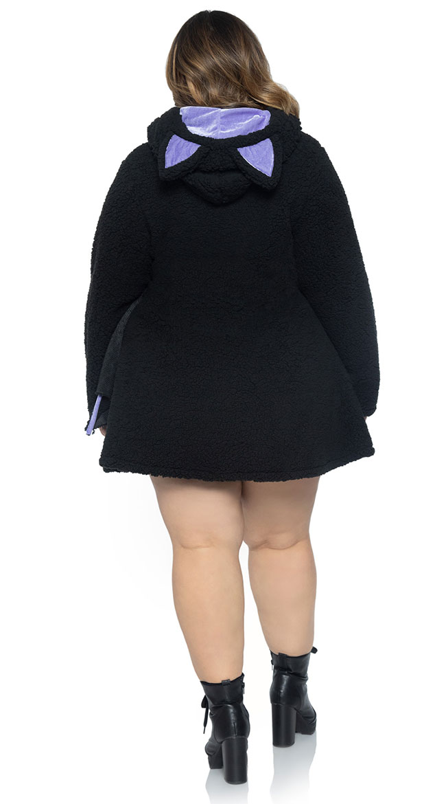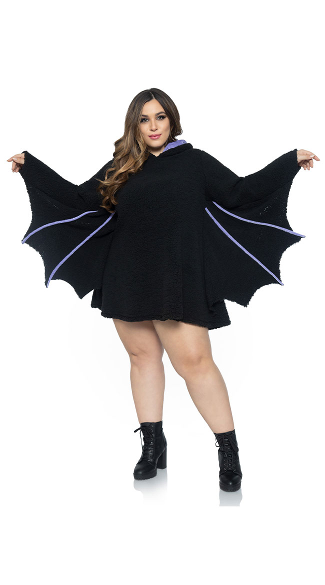 Ready to get batty? Keep them up all night in this plus size Moonlight Bat costume featuring a black ultra-soft teddy dress with purple piping, wing sleeves, and a hood with ears. (Boots not included.)