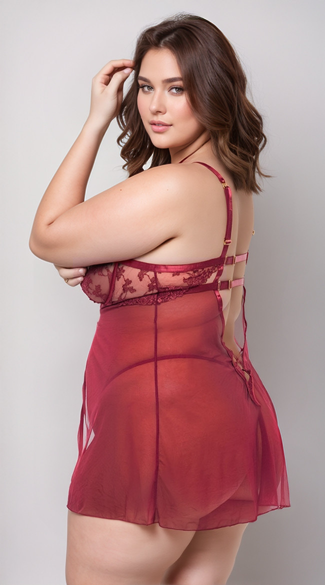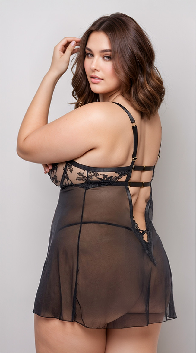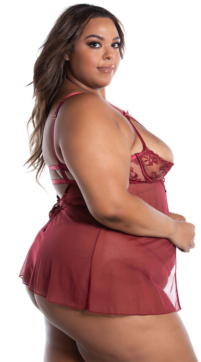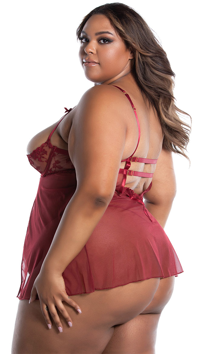 You'll be your babe's favorite fantasy in this captivating plus size babydoll set featuring open underwire cups with a strappy bust detail, a sheer lace underbust, satin bow accents, adjustable spaghetti straps, a cage style back, a sheer mesh flyaway front, a large back keyhole with criss-cross detailing, and a matching g-string panty.
