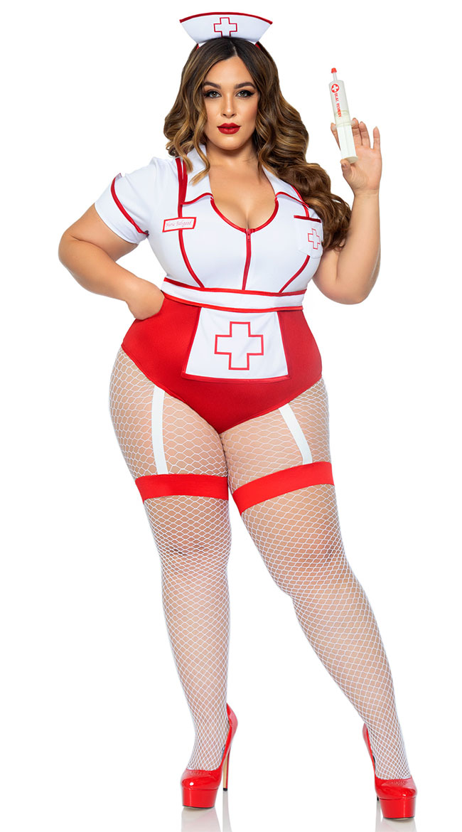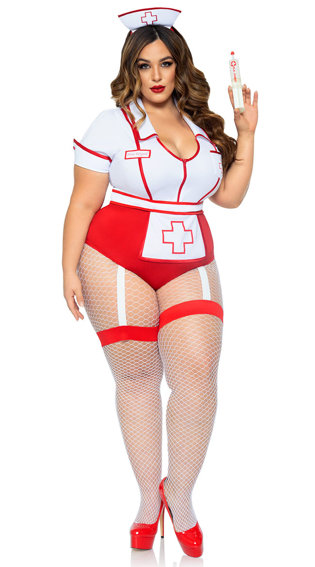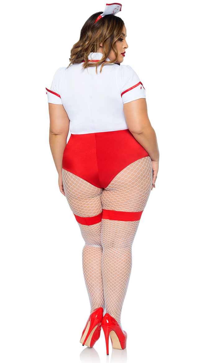 Show me where it hurts! Make them feel better in this plus size Nurse Feel Good costume featuring a red and white short sleeve romper with a snap crotch closure, a zip up front, a name tag detail, an attached apron with a medic logo, attached garter straps with wraparound leg garters, and a matching nurse headpiece. (Syringe, stockings, and shoes not included.)