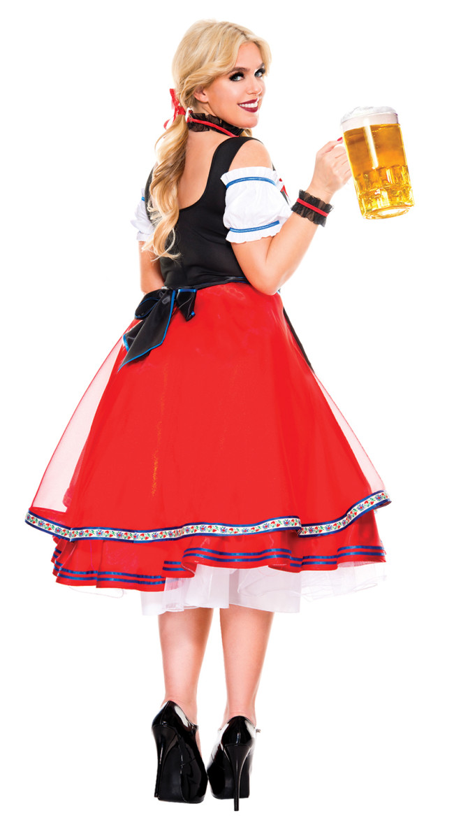 Raise a stein and steal the spotlight in this plus size Oktoberfest beer girl costume. Featuring a flirty off-the-shoulder peasant top with red bow detail, corset-inspired bodice, layered red skirt with apron overlay, and playful trim, this dress is perfect for serving sass and cheers all night long. Prost to being the sexiest brew babe at the party!