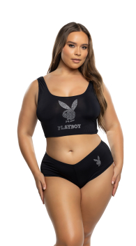 Comfort meets confidence. The Plus Size Playboy Rhinestone Logo Cropped Tank and Brief Set delivers sleek, sporty style with a touch of shine. Crafted in smooth spandex, the cropped tank features a heat-transfer rhinestone Bunny logo that catches the light, while the matching cheeky briefs flatter curves with an easy, confident fit. Perfect for lounging, layering, or flexing your Playboy side—this set does it all.