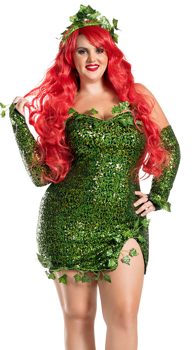 Antagonize your favorite comic book heroes! Turn them all green with envy in this plus size Poisonous Villain costume featuring a green sequin dress with a sweetheart neckline, a sexy side slit, ivy details, a matching ivy headpiece, and fingerless long gloves. (Wig not included.)