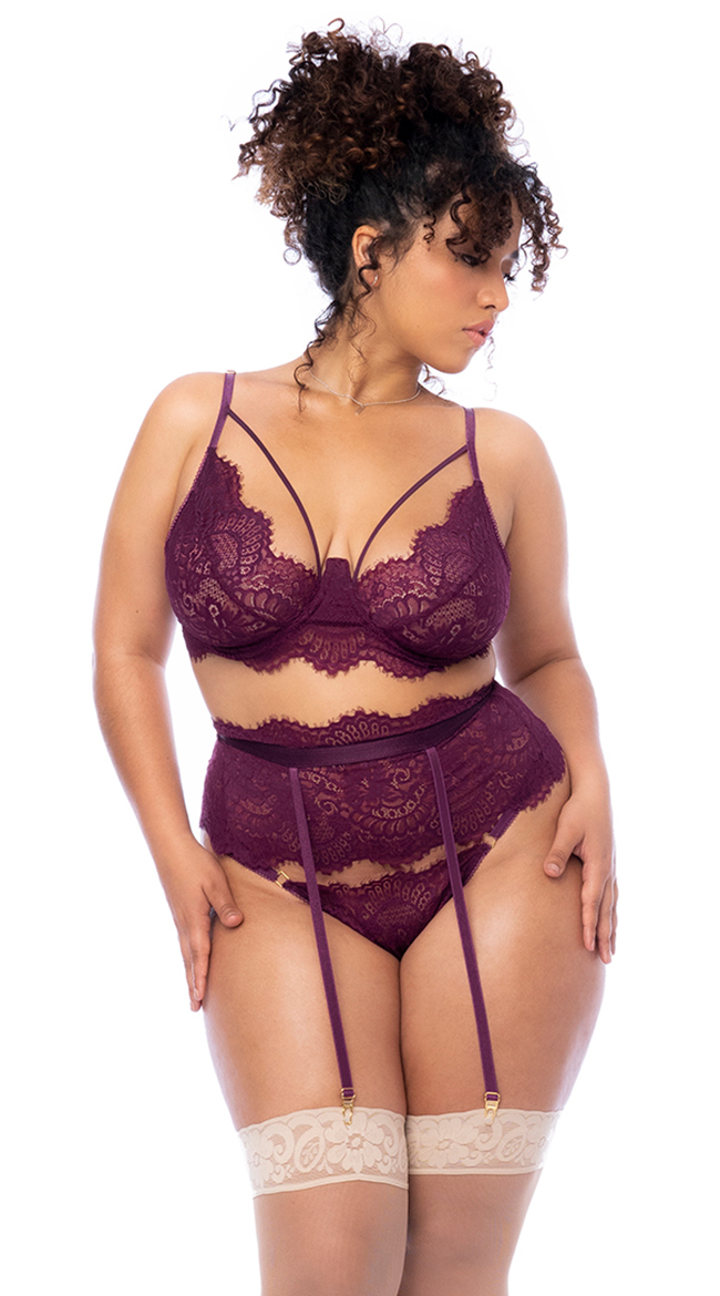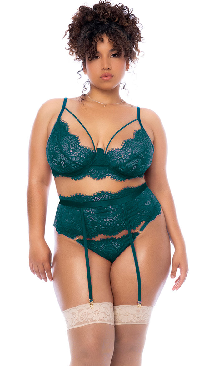• Three-piece eyelash lace set featuring top with underwire and adjustable straps