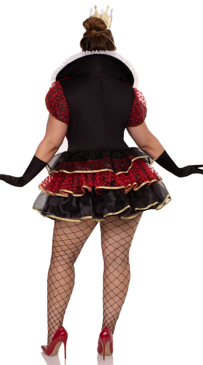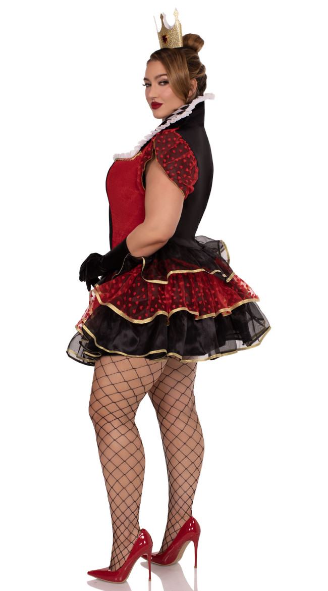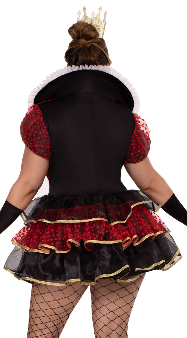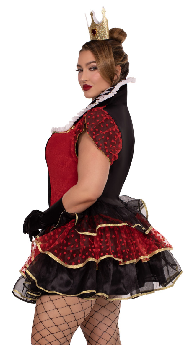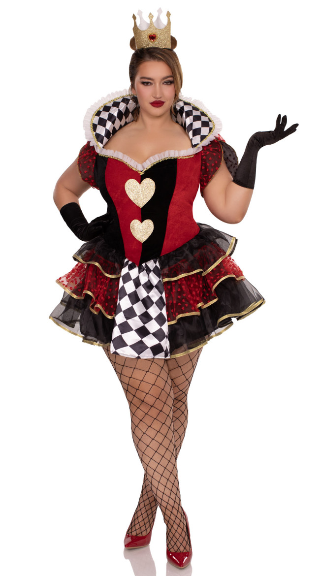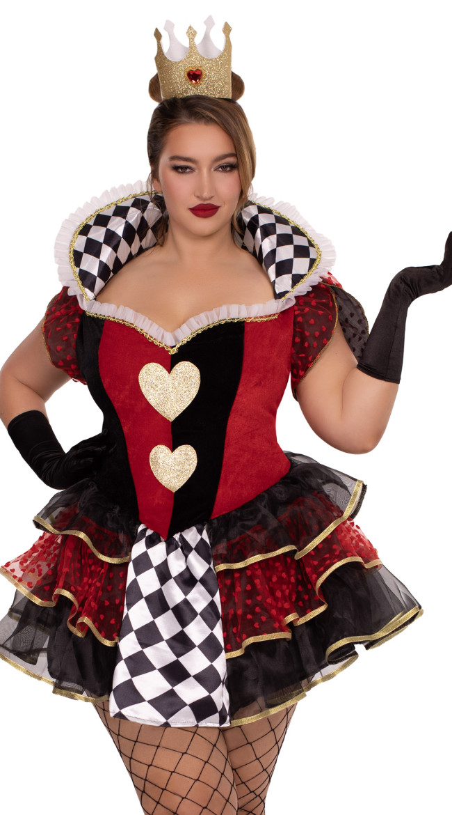 Reign supreme in this sultry Plus Size Queen of Hearts Costume, designed to captivate and command attention. The stunning corset-style bodice with bold heart accents and dramatic puffed sleeves is complemented by a playful, layered tutu skirt with checkered trim. Complete with a regal crown, this costume will have you feeling fierce and fabulous. Stockings and gloves sold separately, but they’re the perfect touch to complete your royal look. Make your royal debut this Halloween and rule with confidence, charm, and a little bit of sass.