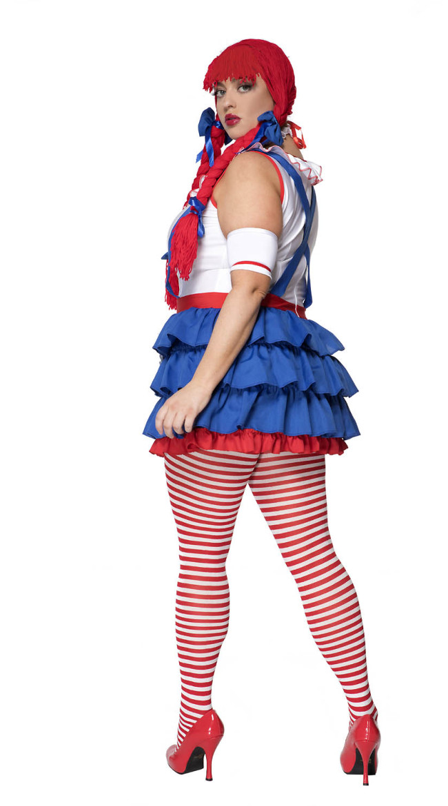 Get nostalgic and oh-so-naughty in this plus size rag doll costume featuring a flirty ruffle-trimmed dress with red button accents, tiered blue skirt, and a mini apron. Striped red and white leggings add a pop of fun, while the playful design makes it the perfect mix of sweet and sexy. A bold Halloween choice that brings classic charm with a flirty twist. Stockings not Included.