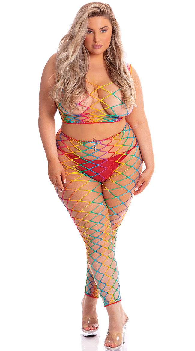 Bring excitement to your night with this fun two piece plus size bodystocking featuring a rainbow netted crop top with a high scoop neckline, sheer net cups, a deep scoop back, and matching high waisted pants with a cropped ankle length. (Panty not included.)