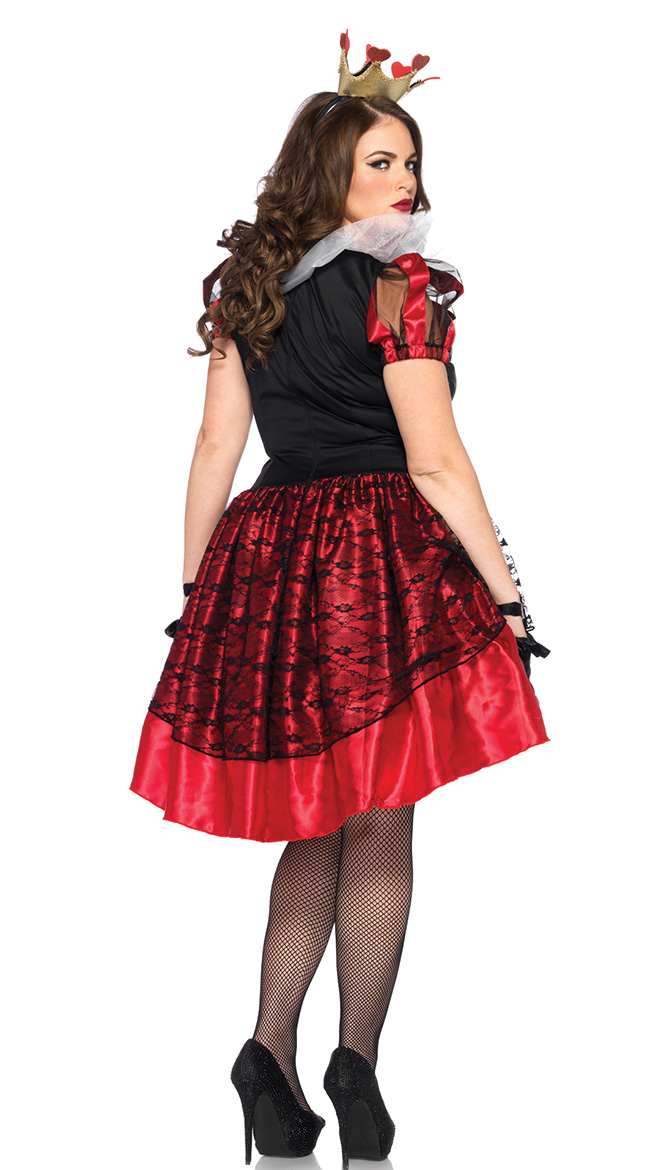 The two-piece, plus size, Royal Red Queen costume includes a red and black satin dress with lace-up front detail, high/low hemline, layered skirt, puff sleeves and crown head piece. (Gloves and stockings sold separately.)