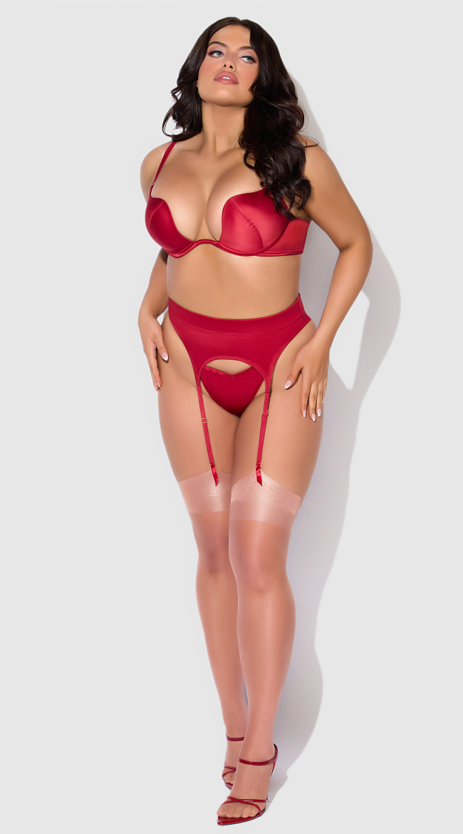 Bold, smooth, and made to be seen. This bra and garter set is serving sleek satin energy with a strappy, high-cut silhouette that shows off every curve. The structured bra gives you that lifted, sculpted shape, while the matching garter belt and panty bring the whole look together with a confident, no-holding-back vibe. This one? It’s here to cause a little trouble.