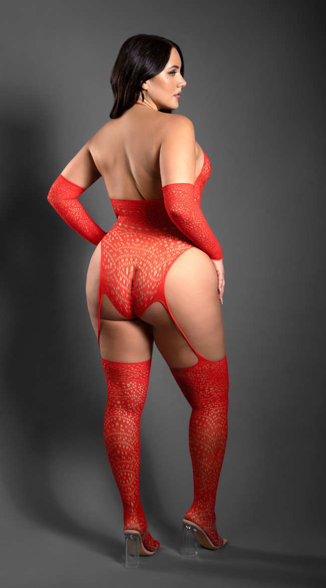 Crotchless halter tie teddy bodystocking and fingerless gloves