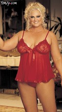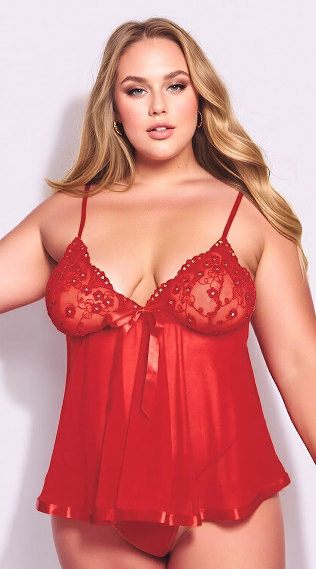 Plus Size sequin, sheer embroidery babydoll with adjustable straps, ribbon trimmed hem and comes with G-string.