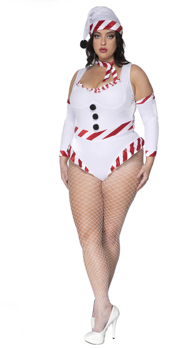 Spice up the holiday season in this flirty candy cane costume featuring a curve-hugging bodysuit with peppermint swirl stripes, oversized button details, and playful shoulder cutouts. Complete with matching striped arm warmers and a coordinating hat, this look is sugar, spice, and everything naughty. Perfect for a festive fantasy that’s equal parts sweet and sassy.