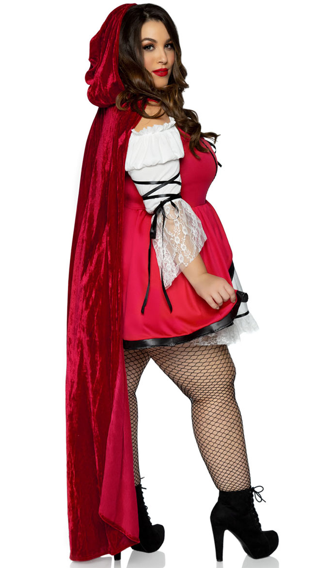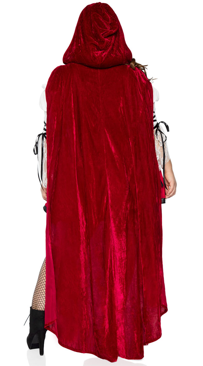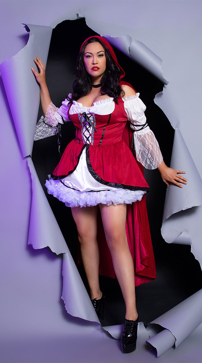 Wolfy I'm home! Strut through grandma's cottage like you own the place in this plus size Sexy Storybook Babe costume featuring a white and red off-the-shoulder peasant dress with lace-up corset waist detail, long sleeves with wrapped up ties and lace cuffs, a satin trimmed split skirt, a matching velvet cape with a hood, and a satin choker. (Basket, stockings, petticoat, and boots not included.)