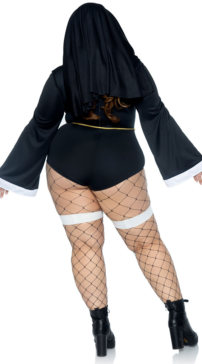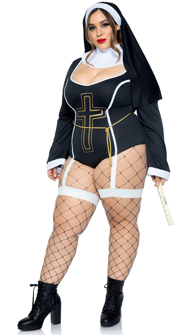 It looks like someone escaped the convent! Break all the rules in this plus size Sister Sin costume featuring a black long sleeve romper with flared sleeves, attached white garter straps with wraparound leg garters, a gold cross detail, a gold lurex belt, and a nun habit. (Stockings and shoes not included.)