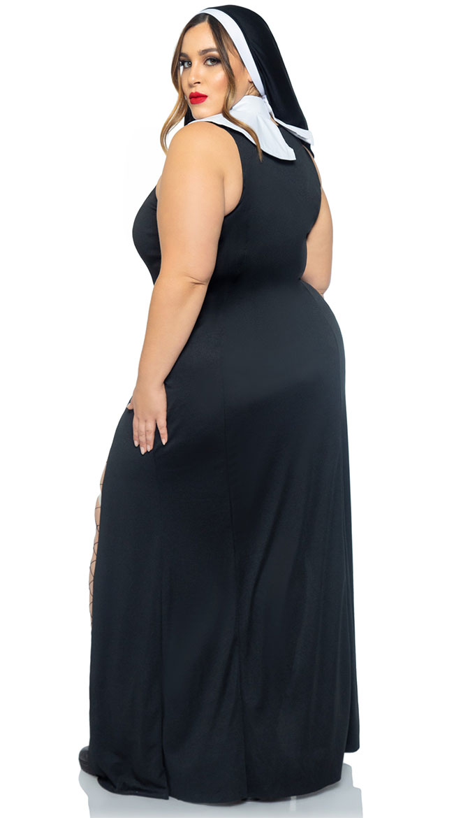 Say your prayers! Take an oath to be sexy in this plus size Sultry Sinner costume featuring a black dress with dual slits, attached garter straps with wraparound leg garters, a white wet look cross detail, a collar, and a nun habit. (Shoes not included.)