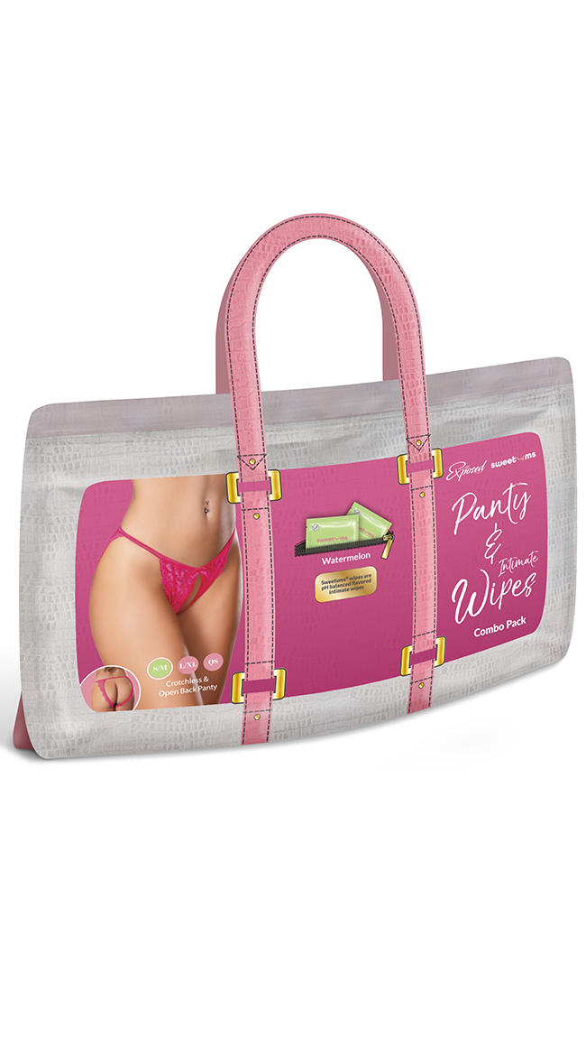 A lace crotchless tanga featuring an exposed back and scalloped edges. Comes in a reusable pink-handle pouch perfect for gifting or packing intimates for your next tripPaired with 2 packets of Watermelon flavored Sweetums pH balanced intimate wipes. With a crisp, sweet scent and a light kiss of flavor, these wipes are designed to keep you feeling fresh, flirty, and totally irresistible — anytime, anywhere.Here’s a juicy bonus: research shows that the scent of watermelon can spark feelings of joy, relaxation, and even boost arousal. It’s soft, nostalgic, and completely intoxicating — the kind of scent you'll want to savor again and again.Whether you're freshening up post-gym, pre-date, or adding something playful to your bedroom routine, these wipes deliver.Each wipe is pH-balanced and carefully formulated with your body’s chemistry in mind. Whether you're at home or on the go, these individually wrapped wipes are designed for discreet convenience and undeniable pleasure.- pH balanced- Vegan- Made in the USA- No added parabens - No added dyes - Cruelty free - Water-based & non-stickyIngredients - Water, Glycerin, Stevia Rebaudiana Extract, Xanthan Gum, Citric Acid, Sodium Benzoate, Potassium Sorbate, FlavorHow to use - Remove the wipe from the package. Wipe intimate areas. The wipe leaves behind scent and flavor. Discard the wipe after one use.