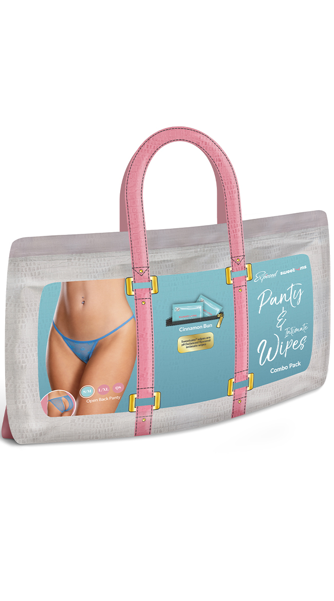 A crotchless panty featuring heart design mesh and an exposed back design with an O-Ring gold tone back detail. Paired with 2 packets of Cinnamon Buns flavored Sweetums pH balanced intimate wipes. Studies show that cinnamon bun and vanilla scents are especially arousing to men. Our Cinnamon Bun flavored Sweetums wipes tap into that irresistible warmth — think gooey, sweet, and just a touch decadent. Surprisingly bold and oh-so-delicious, this wipe has quickly become a fan favorite — even among the skeptics. The scent and flavor are a bit stronger than our lighter options, making it the perfect choice for leaving a lasting impression. Comforting, cozy, and a little naughty? Yes, please.Comes in a reusable pink-handle pouch perfect for gifting or packing intimates for your next tripEach wipe is pH-balanced and carefully formulated with your body’s chemistry in mind. Whether you're at home or on the go, these individually wrapped wipes are designed for discreet convenience and undeniable pleasure.- pH balanced- Vegan- Made in the USA- No added parabens - No added dyes - Cruelty free - Water-based & non-stickyIngredients - Water, Glycerin, Stevia Rebaudiana Extract, Xanthan Gum, Citric Acid, Sodium Benzoate, Potassium Sorbate, FlavorHow to use - Remove the wipe from the package. Wipe intimate areas. The wipe leaves behind scent and flavor. Discard the wipe after one use.